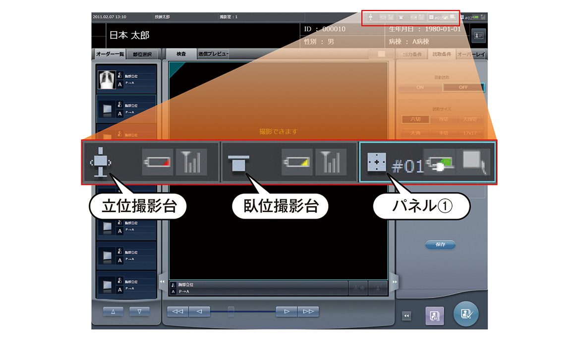 1撮影室に複数枚のパネルが導入された場合でも、パネルの移動に追従してどこの撮影台に装填されたかなど、パネル制御と画面表示が連動するため、どこにパネルが所在しているかなど覚えておく必要も無く、直感的かつストレスの無い操作性を実現しています。