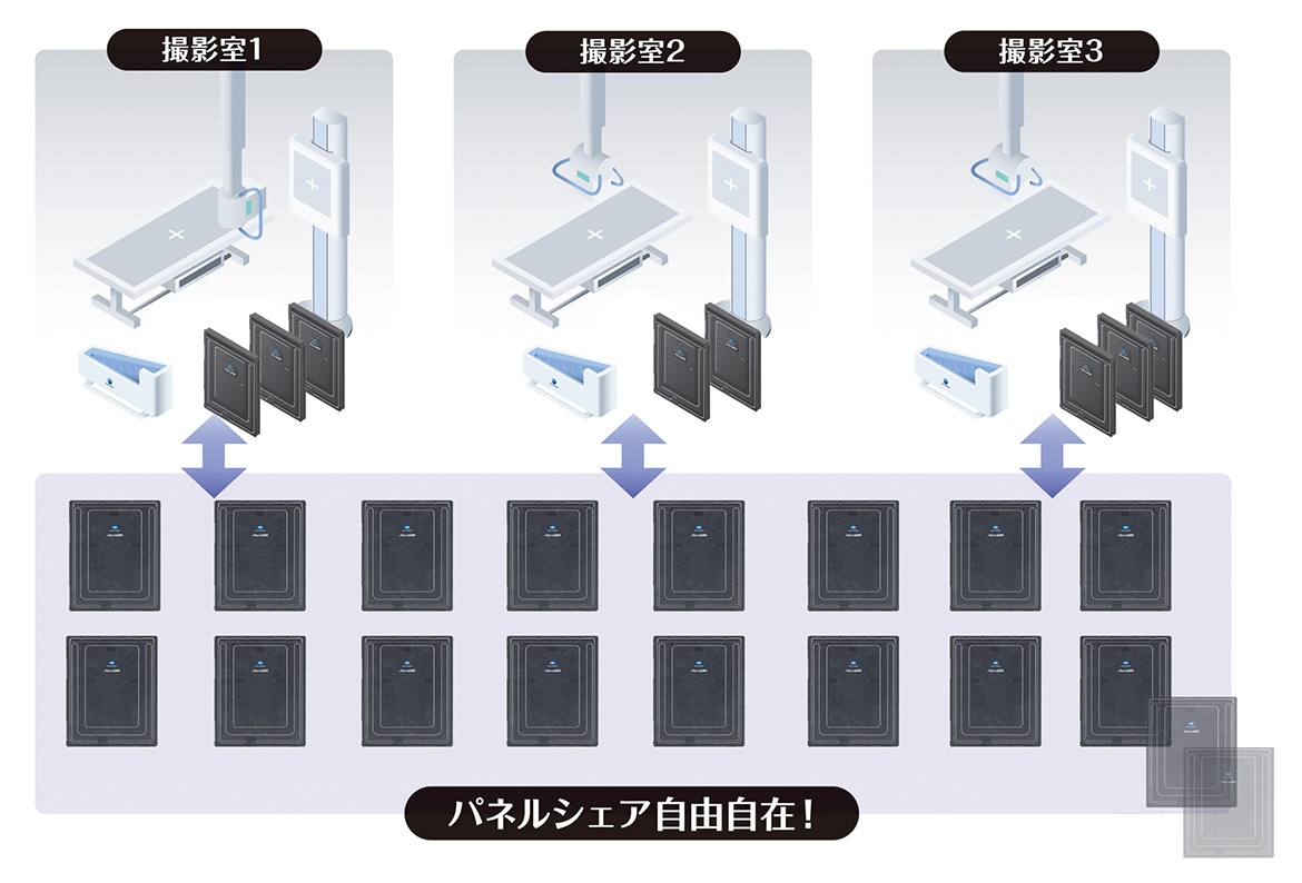 簡単なローミング操作により1枚のパネルを複数撮影室間で共通利用でき、また、システム上に登録可能なパネル数にも制限がないため、余計な意識をすることなく撮影室間のシェア利用ができます。CRカセッテ同様、自由度の高い運用とパネル枚数の最適化に貢献します。
