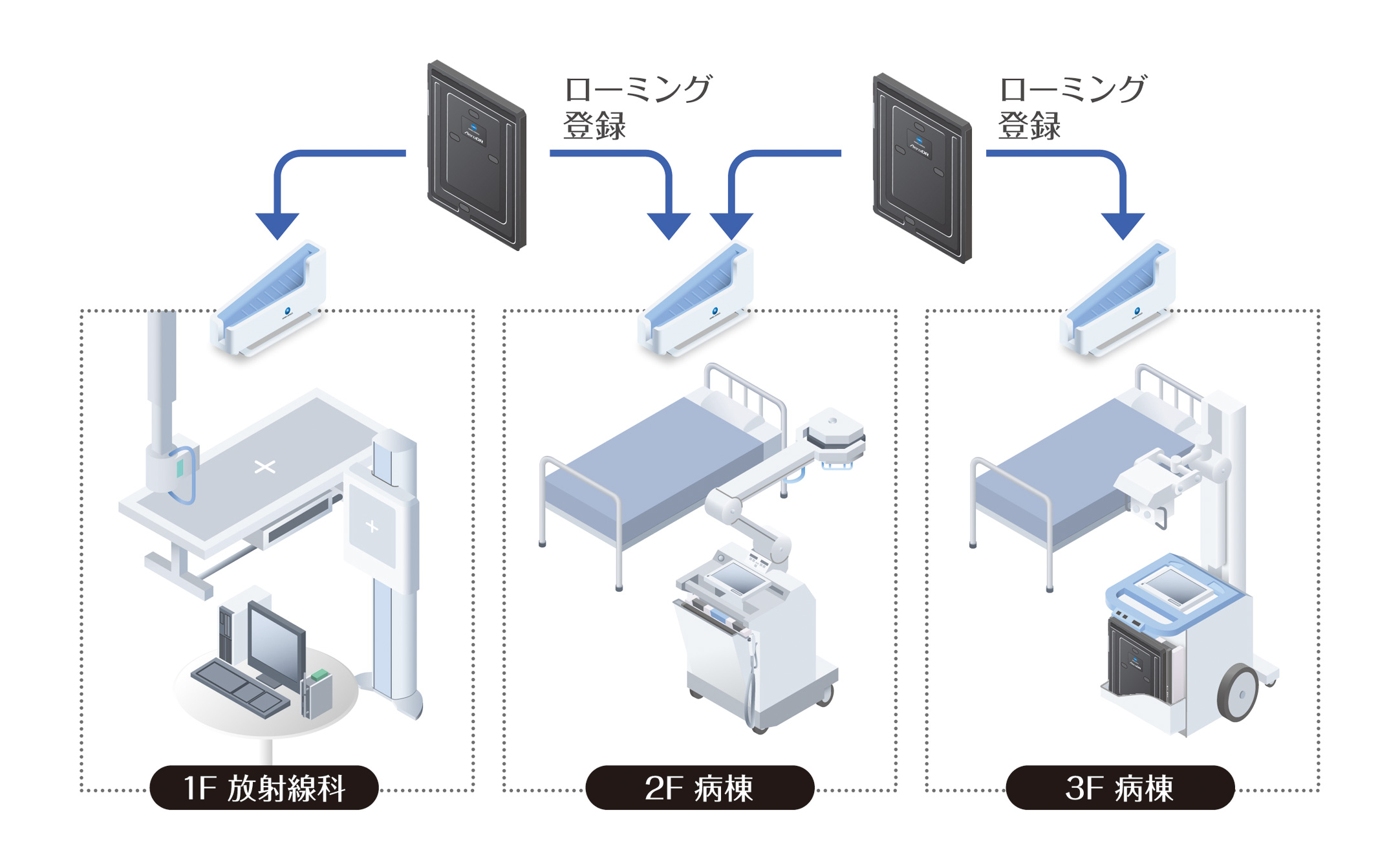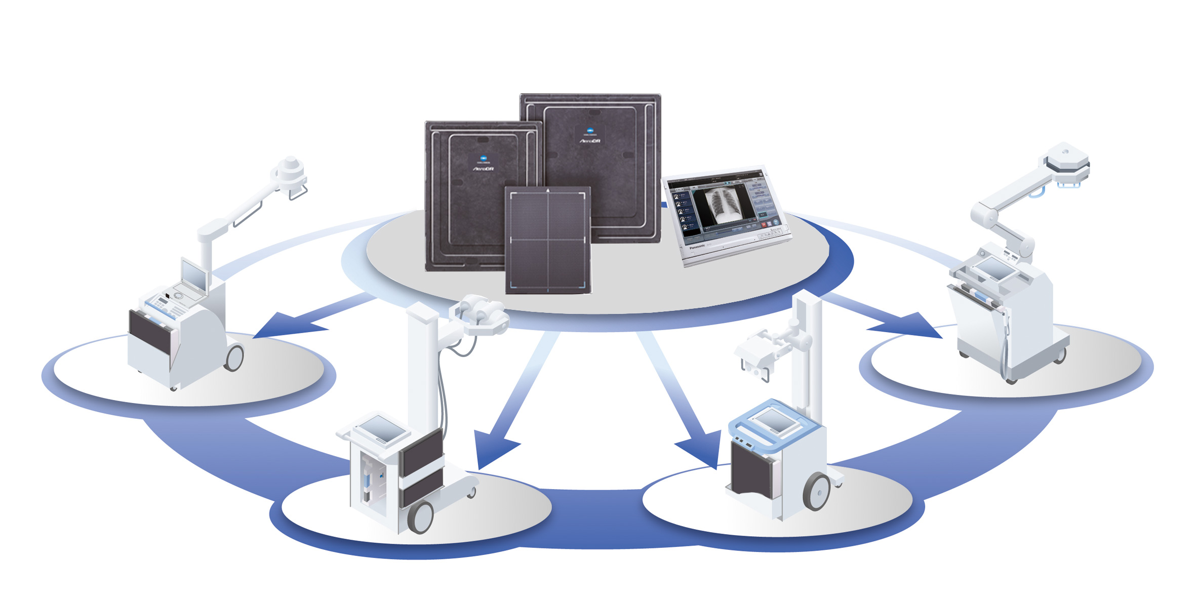 AeroDRパネルをポータブル撮影用として限定して使用する必要はありません。一般撮影室とのパネル共用が可能なため、運用や予算に合わせて最適なレイアウトでご提案することができます。