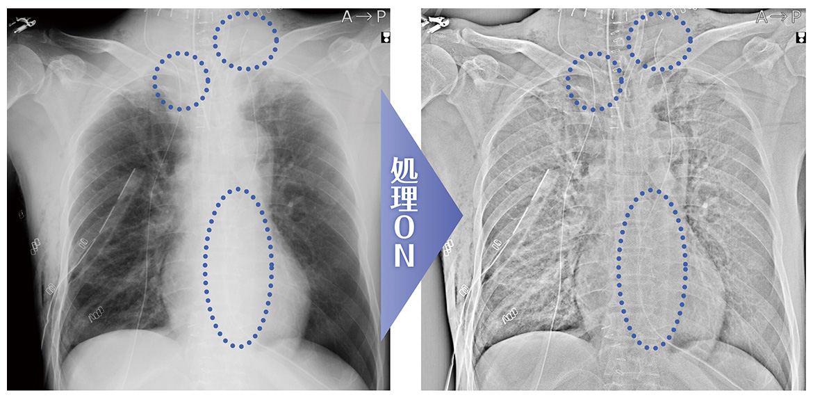 ポータブル撮影の目的は、経過観察だけではなく、術後の残存物確認(ガーゼカウント)や、カテーテルや挿管チューブのルート確認等も挙げられます。CS-7 Portableには、そのための専用処理を搭載しました。カテーテルやガーゼなどの確認をしやすくし、即時画像確認のメリットを最大限に活かすことができます。