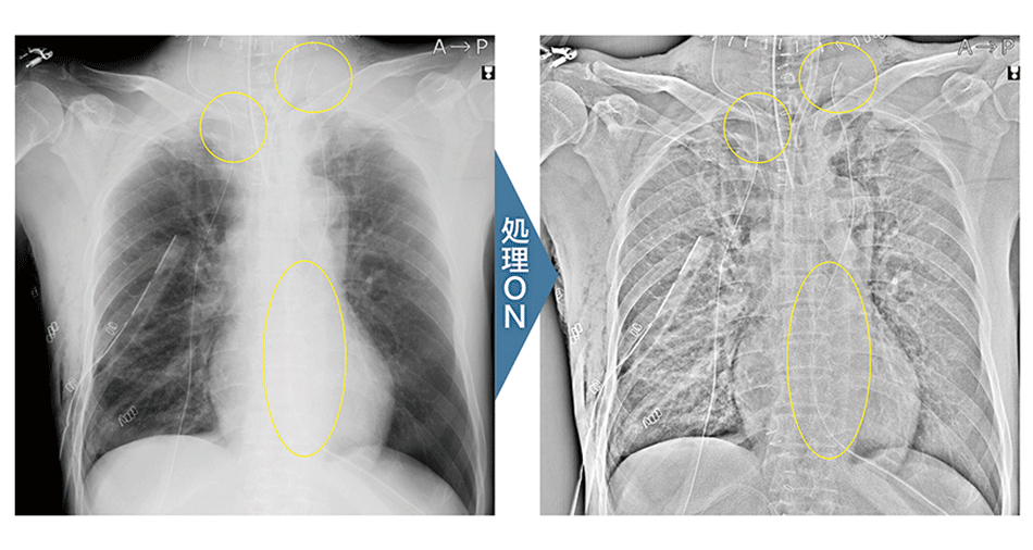 ポータブル撮影における残存物確認や、カテーテルの先端位置、ルート確認をしやすくするための 専用画像処理を搭載しています。 適用対象部位を拡大したことにより、ガラス片の確認や、胆道造影、 椎体の穿刺画像など多様なシーンでその効果が期待できます。