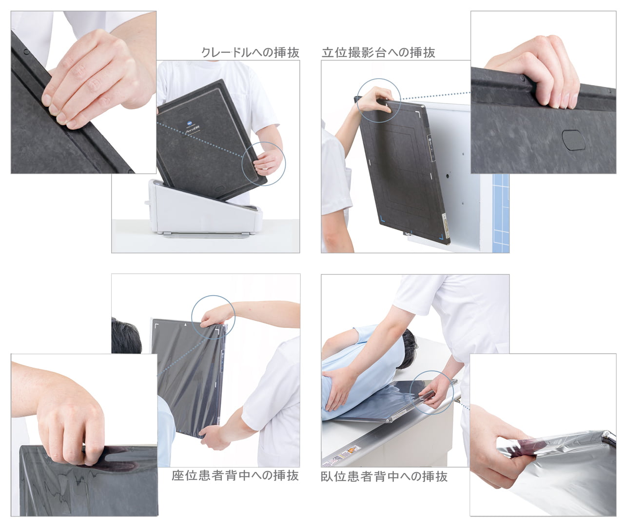 どの方向からも指が掛けやすく、またカセッテカバー越しにも掴みやすいデザインです。Ⅹ線検査におけるさまざまなシチュエーションで、持ちやすいパネルは技師の作業をサポートします。使用後の疲労感やパネルを落としてしまう不安感など、ストレスを軽減させることができます。