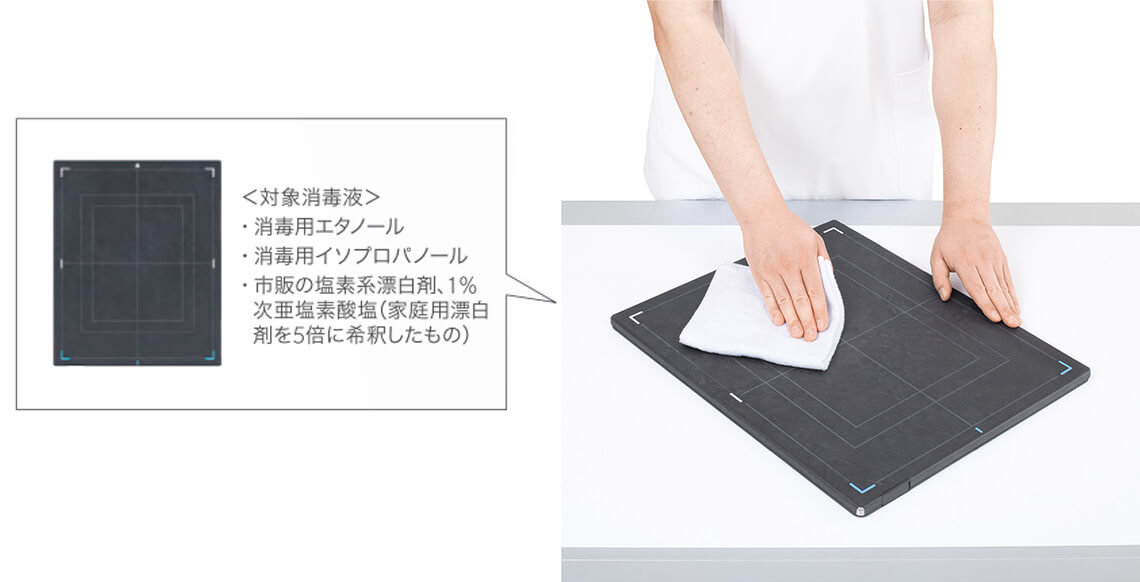 AeroDR swiftは1%濃度の次亜塩素酸ナトリウム溶液に対応。日本診療放射線技師会感染症対策ガイドライン(Version 1.1)に準拠しています。患者の血液や尿によって汚れたパネルを1%濃度の次亜塩素酸ナトリウム溶液の消毒液で清拭した場合でも、変色や筐体の傷つきを気にせず、安心してご利用いただけます。