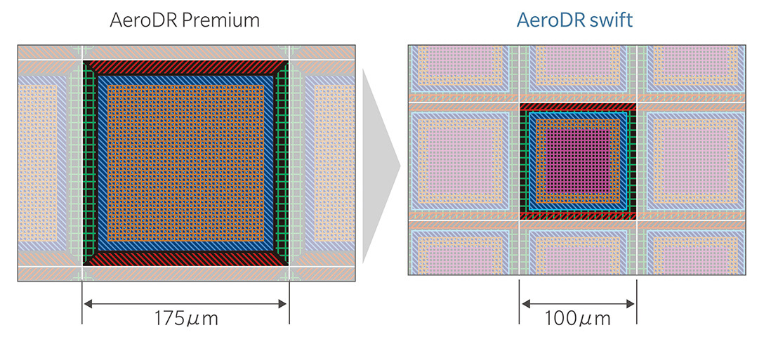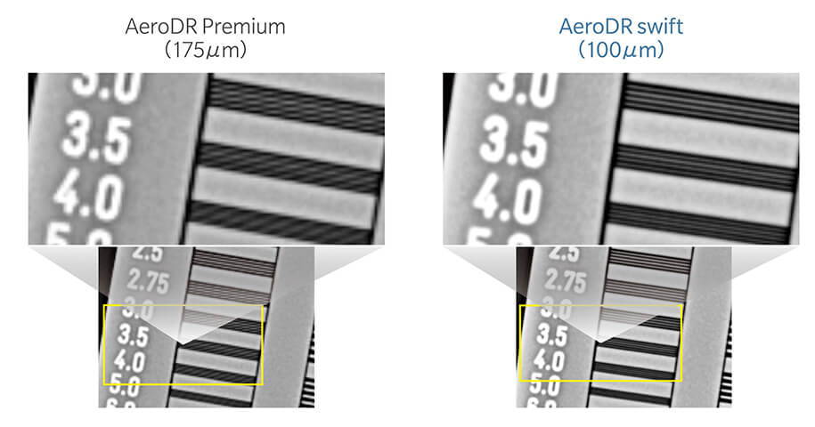 AeroDR swiftは画素サイズ100μmを実現。ビニング処理により、100μm/200μmを撮影プロトコルに応じて使い分ける事ができます。