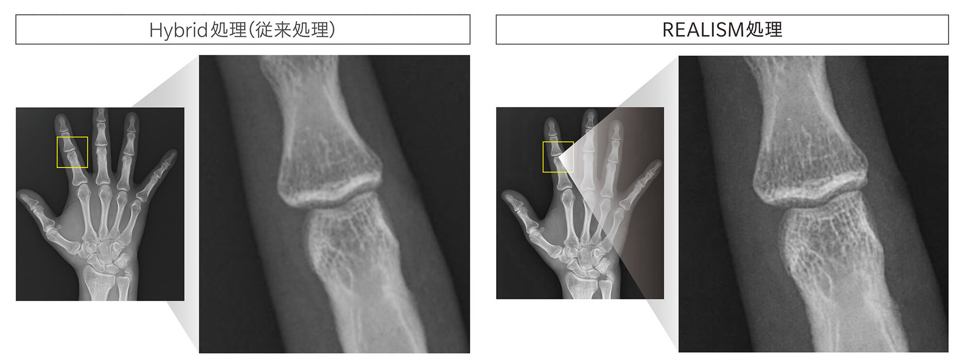 改良されたダイナミックレンジ圧縮の処理と、新規のLUT(階調カーブ)により、低線量域から高線量域まで各構造物を立体的に表現し、白トビ・黒ツブレを起こすことなく画像全体を自然なままに描出することで立体感のある画像を提供します。