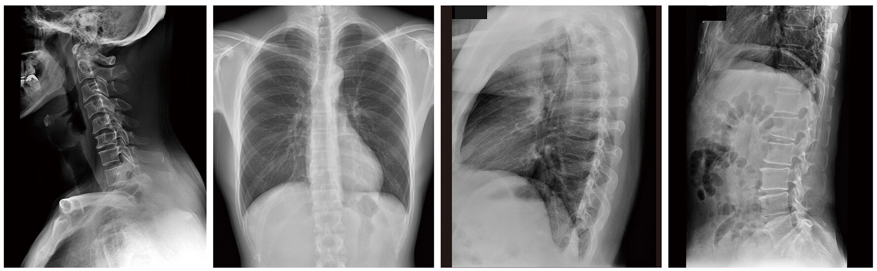 ・頭部(頭蓋骨、トルコ鞍、頬骨、副鼻腔、眼窩、顎関節、聴器、耳下腺、顎下など)・頸部(頸部、咽頭、甲状腺)・頸椎(正面、側面、斜位)・鎖骨(正面、側面)・肩関節(正面、側面、斜位)・胸鎖関節(側面)・胸部(正面、側面、斜位)・胸椎(正面、側面)・腰椎(正面、側面、斜位)・腹部(正面、側面)・骨盤(正面、斜位)・両股関節/股関節・大腿骨/右大腿骨/左大腿骨・膝関節(正面、側面、軸位)・小児胸部(正面、斜位)・胸骨(側面、斜位)・肋骨(正面、斜位、接線)・乳幼児胸腹・乳幼児股関節