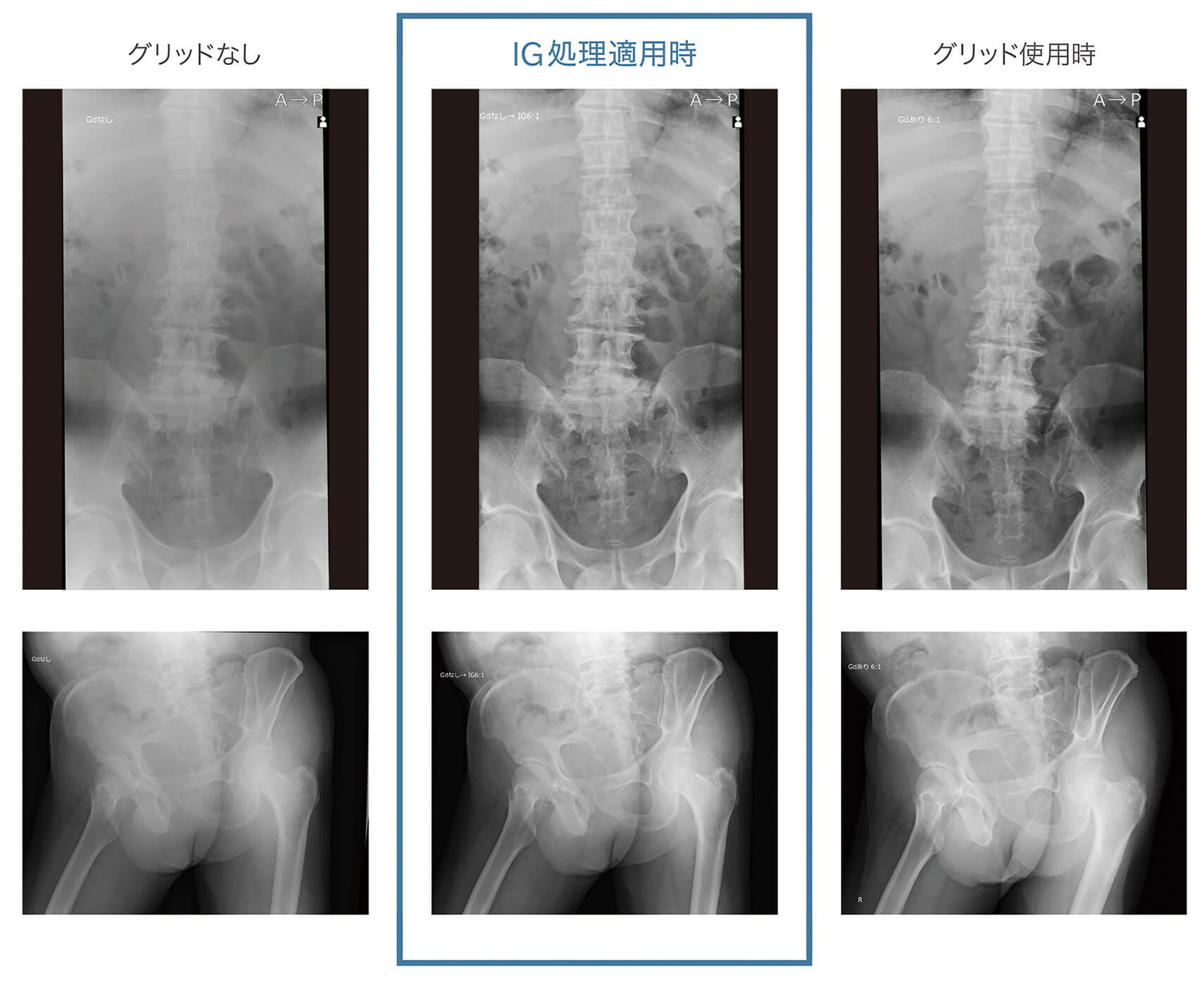 散乱線補正処理「インテリジェントグリッド(IG)」の利用により、使用シーンはさらに拡大。グリッドを使用しにくいポータブル撮影などに加え、撮影室内で一般的にグリッドが必要とされる全部位に対応し高品質な画像を提供します。一般撮影装置との撮影条件連携により、シームレスな画像調整が可能です。
