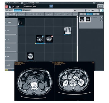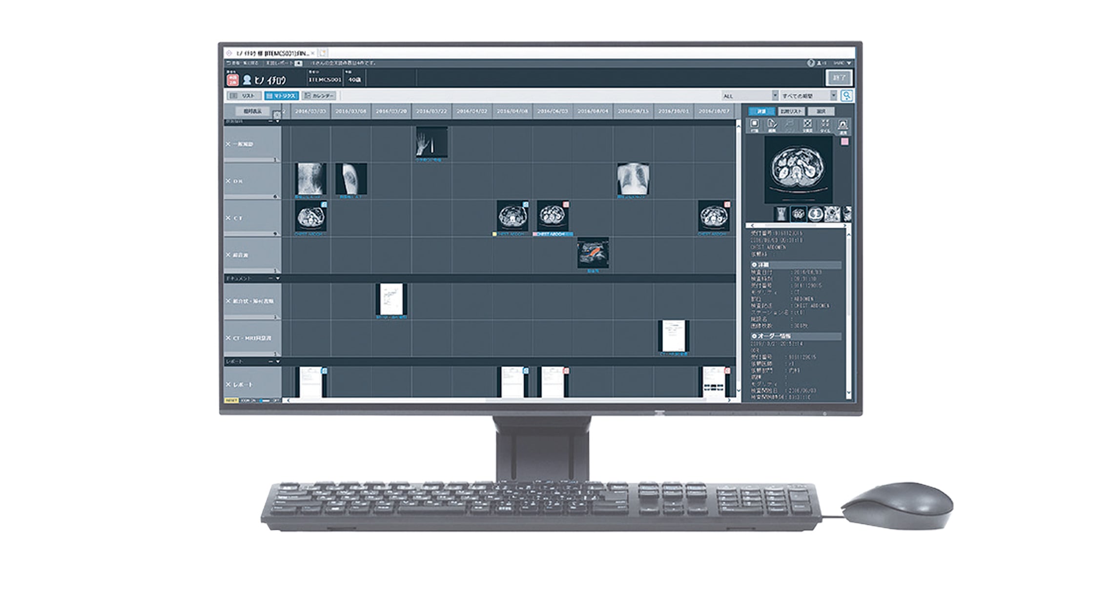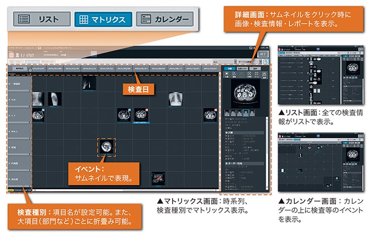 基本画面は、マトリックス・リスト・カレンダー形式の3つから選択が可能で、自由な項目設定や縦横軸の切替も可能です。 また、レポート情報も同一画面内で確認でき、必要に応じて読影用PACSやレポートシステムなどの連携起動が可能となっており、医療従事者が、患者の状態を俯瞰的、効率的に確認することをサポートします。