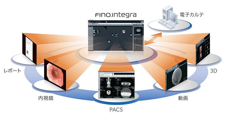 オーダー情報、画像、動画、レポート、心電図、文書ファイルなどの幅広いデータに対応しています。 患者単位で検査に関する情報を一元管理・閲覧できるようになり、複数のシステムをFINO.Integra上から起動できるようになるので、業務の効率化に貢献します。