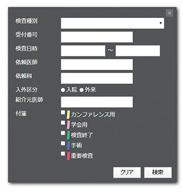 検査種別、検査日時、依頼医師、依頼科、付箋などで検索が出来ます。