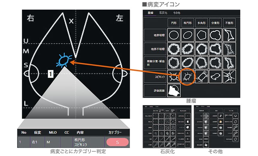 マンモグラフィガイドラインに準拠したレポーティングシステムでは、病変アイコンの貼り付けにより部位や病変情報、カテゴリーを自動反映し、簡単入力を実現します。 乳腺超音波の入力にも対応し、マンモグラフィと乳腺超音波検査の総合判定が可能です。 多彩な検索機能の搭載により、統計・集計にも有用です。