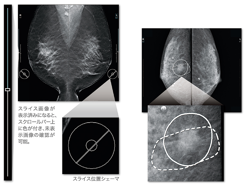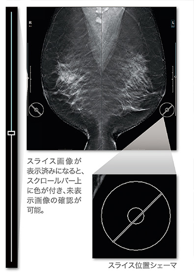 トモシンセシス:シェーマ表示によりスライス位置の把握が一目で可能です。また、自動再生機能や未表示画像確認機能により、精度の高い診断を支援します。