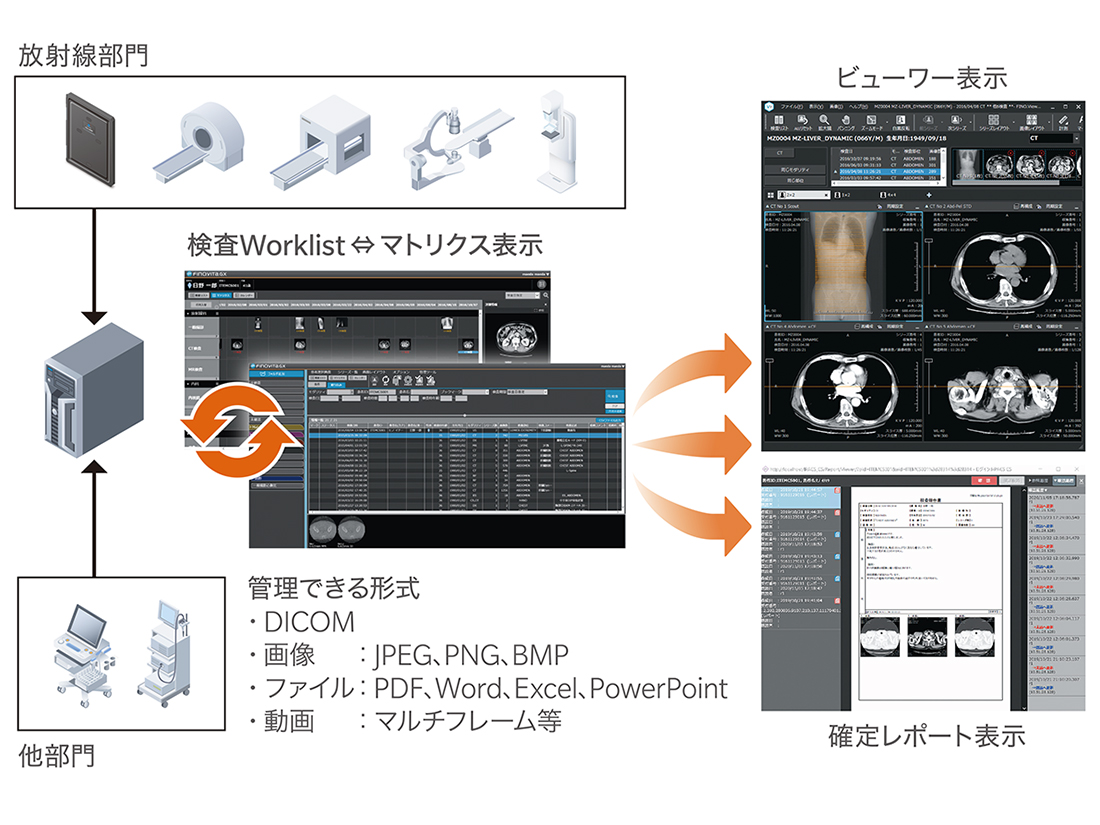 DICOM以外にも、患部写真や紹介状・同意書・その他、患者様に関連するあらゆる検査画像情報を統合・⼀覧表⽰します。必要な情報を効率よく確認することで、医療の質向上と業務の効率化に貢献します。