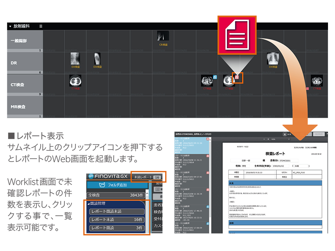未確認の検査結果レポートが⼀⽬でわかるようになり、レポート⾒落とし発⽣リスクを抑⽌し、安全なレポート既読管理が⾏なえます。専⽤のレポートビューワーで、レポートを確認でき、過去レポートも簡単に切替表⽰もできます。