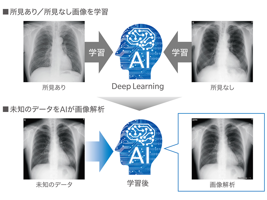 専⾨医のスキルを学習したAIが胸部X線画像を解析し、医師による胸部X線画像の読影において、肺がんが疑われる所⾒である結節影や、肺炎や結核など感染症の所⾒である浸潤影の⾒落とし防⽌を⽀援します。