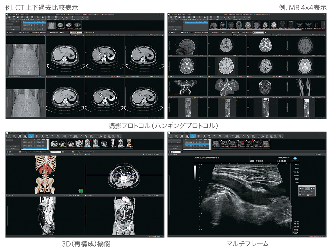 PACSビューワーとしての基本機能に加え、2D、3D、動画等さまざまな画像の表⽰に対応し、表⽰レイアウトもモダリティや検査部位毎に設定することが可能です。