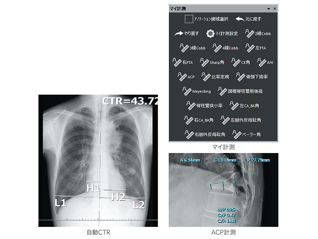 距離や⾓度計測などの⼀般的な計測はもちろん、少し複雑な計測機能を登録できる“マイ計測機能”や、ワンクリックで⾃動で⼼胸⽐計測機能を標準搭載。⼼胸⽐計測結果は、計測値を保存してワークリスト上で経時的に確認することも可能です。
