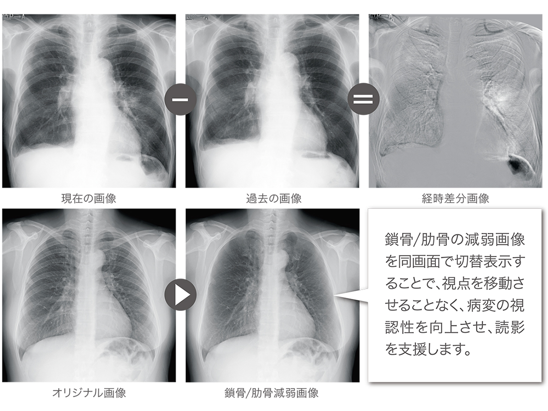 ⼀⽅、胸部経時差分処理は、胸部の「現在」と「過去」の画像を差し引き、変化を⾒やすくした画像を⽣成します。