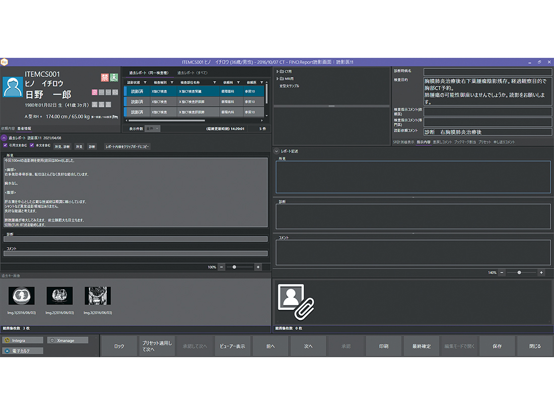 定型⽂や定型プリセット、キー画像の貼り付けやアノテーション機能、過去レポートとの⽐較・引⽤等、その他にも豊富な機能で読影を強⼒にサポートします。