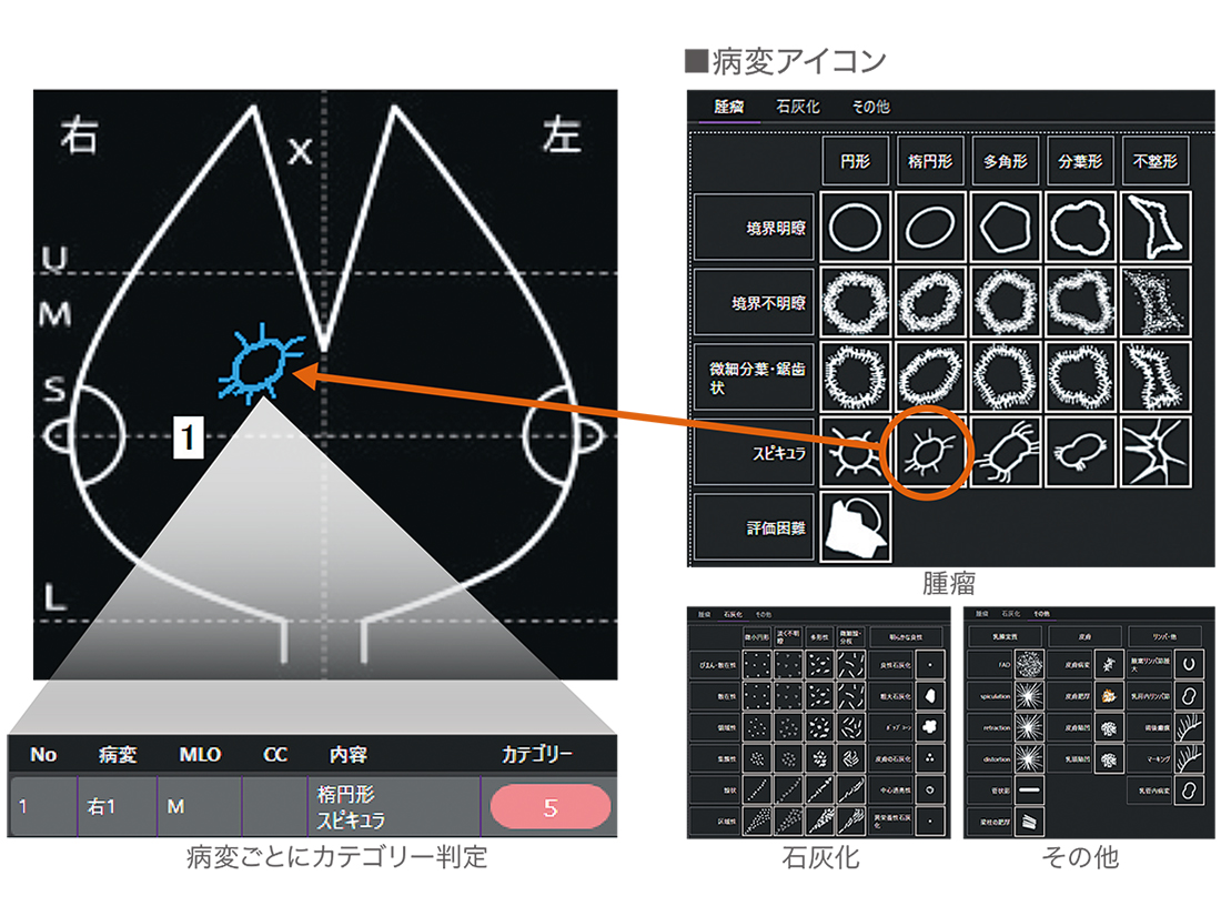 病変シェーマに応じて、自動的にカテゴリー判定を反映し、マンモグラフィガイドラインに沿ったレポート⼊⼒が可能です。