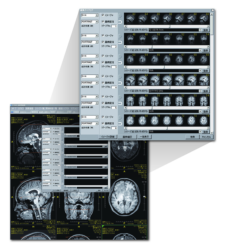 画像の並び順や濃度・階調などの変更に加え、シリーズの分離・結合や画像の出力・未出力を確認・決定した後、他のPACSやImagerなどに出力する『検像機能』を標準搭載。画像参照に必要な画像のみを選択して配信・フィルム出力することで、煩わしい画像検索や画像送り操作を低減し、目的の画像をいち早く表示・確認することが可能です。