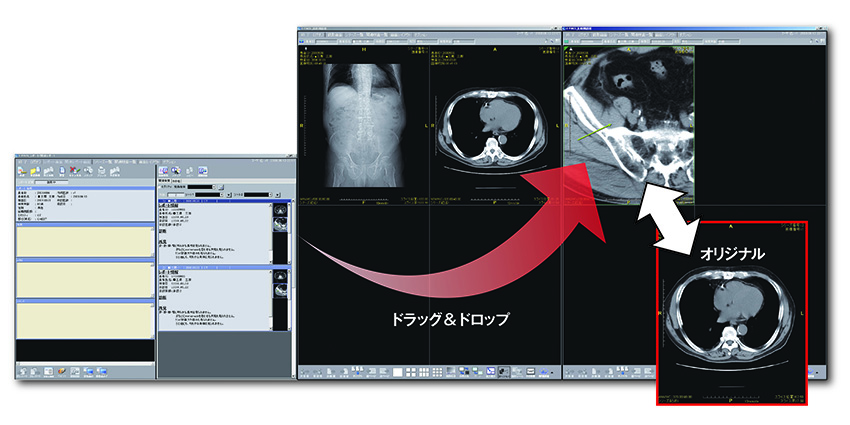 レポート作成時にキー画像として添付された画像について、レポート添付キー画像を読影画面上にマウスにてドラッグ&ドロップする簡単な操作で、スライス位置・拡大率・階調処理・アノテーションなどレポートを作成した読影時の状態にて、全シリーズ画像を表示・操作する事が可能です。