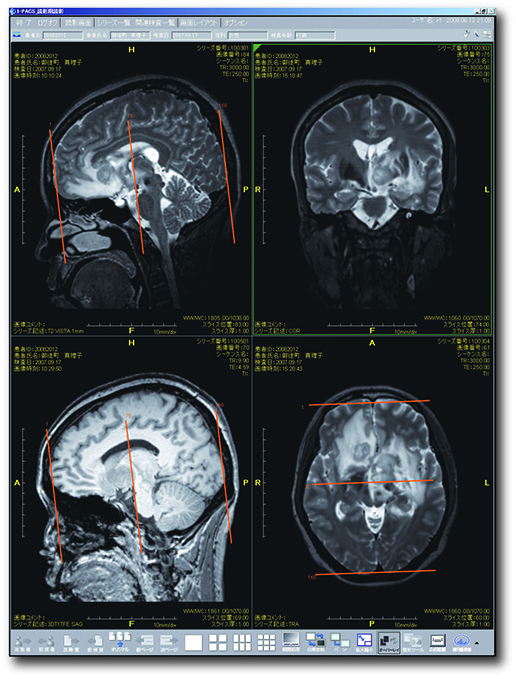 各スライス画像の位置を表示するリファレンスラインを、CTはスカウト画像に、MRIはアクティブフレーム以外(クロスリファレンス)に表示することが可能です。