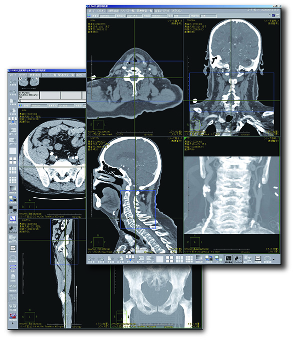 CTのアキシャル画像より、サジタル及びコロナル画像を生成するMPR機能を搭載しており、画素の最大値を画像化するMIP画像も表示されます。