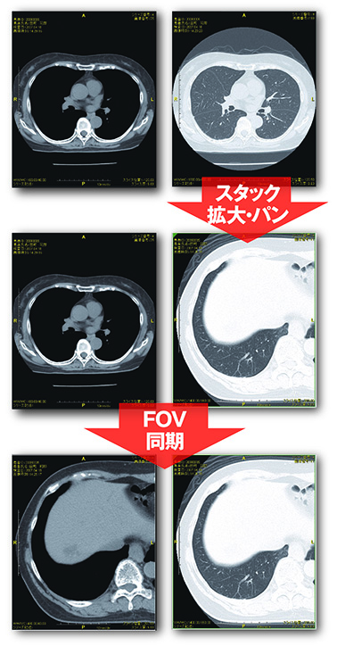 異なる拡大率の画像を自動的に揃え、撮影時のスライス厚が異なる画像を近似スライスにて同期して表示する、FOV同期機能を搭載しています。