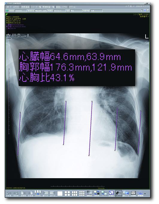 画像に図形やテキストなどを描画として注釈をつけることや、距離・角度・面積の計測・演算に加え、心胸郭比計測も可能です。