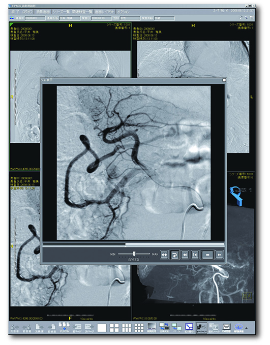 読影画面に表示されている検査(シリーズ)を、別画面にて一定間隔で動画のように表示することが出来ます。再生速度の変更や巻き戻し・ループ再生も可能です。