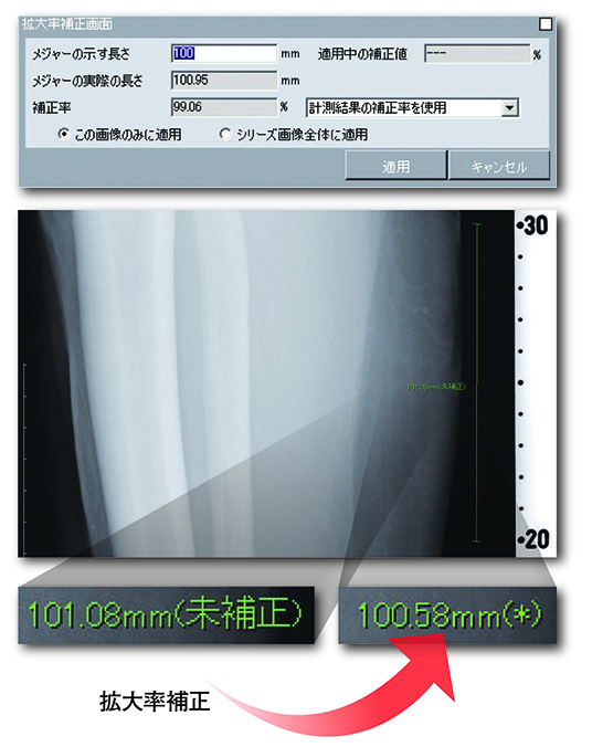 CR撮影時に鉛尺などを一緒に撮影して頂くことにより、画像の拡大率を補正してPACS上で実距離計測が出来る、拡大率補正機能を搭載しています。
