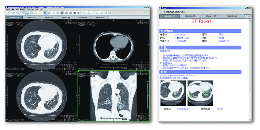 また、読影レポートについては、HTMLファイル形式及びPDFファイル形式にて出力が可能で、弊社PDI-Viewer上では画像データと連携しての表示や、画像と同様に同時に複数のレポートを比較表示が出来ます。