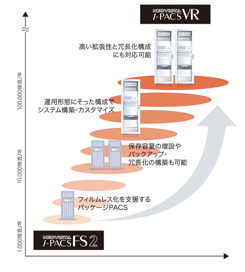 PACSの導入は、その使用目的や経営上の投資計画において過不足ない最適なシステムである必要があり、NEOVISTA I-PACSは高い拡張性と柔軟なシステム設計を許容するスケーラブルなPACSシステムです。