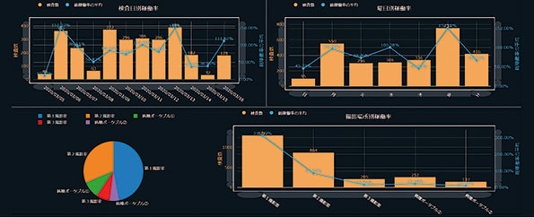 当社DR用コンソール「CS-7」が保持する詳細なログ情報を活用し、曜日ごとの検査数や撮影室稼働率をはじめ、再撮影率や検査所要時間、Exposure Index(EI)、Deviation Index(DI)など、幅広い値を曜日、時間帯、部位、撮影者など様々な切り口で分析することが可能。業務効率化、検査体制最適化のご検討をサポート致します。また、「FINO.XManage」として管理している入射表面線量データも活用し、線量の過不足等もDRLとの比較をしながら分析することが可能です。(オプション機能)