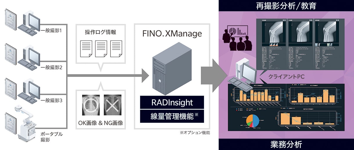 「RADInsight(ラドインサイト)」は、当社DR用コンソール「CS-7」より、詳細な検査履歴データ およびNG画像も含む全画像を収集・見える化することで、再撮影管理と教育、業務分析を支援するシステムです。