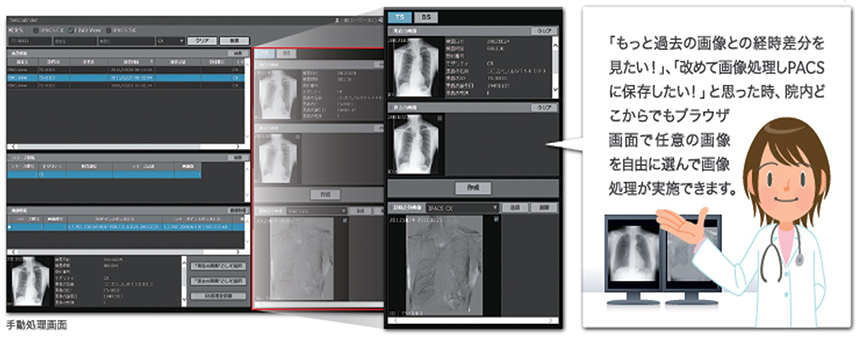 さらに、それらの画像に対して、胸部AI画像解析、胸部骨減弱処理、胸部経時差分処理を行いPACSへ送信する機能を有しています。
