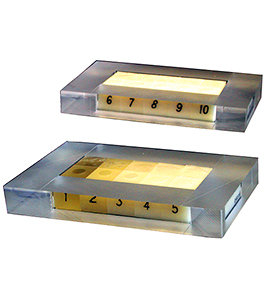 マンモグラフィの画質評価や品質管理の基礎として使用されるACR規格準拠のファントムです。ファントムは脂肪50%、乳腺50%の圧迫された4.2cm厚の乳房を模擬しています。ワックスブロック内には乳房撮影時に見られる構造や悪性腫瘍を模擬した各種テストオブジェクトが配置されています。日常的には診断結果に影響するような画質の変化の検出の手助けとなるほか、グリッドやフィルタ、フィルム現像時などアナログ / デジタルの撮影システムに見られるアーチファクトの識別にも有効です。