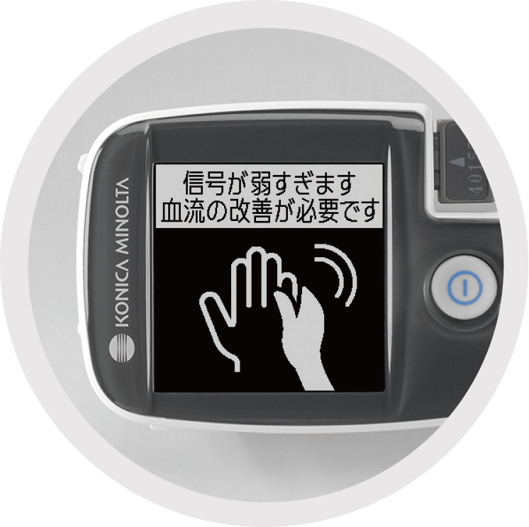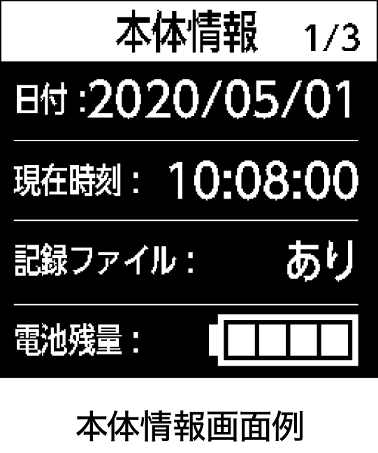 文字と図を用いたわかりやすい表示により、エラー発生時も対処法が簡単にわかり、患者の不安感を軽減します。また、本体情報として、現在時刻、オートパワーオフ、機器番号などを確認することができます。