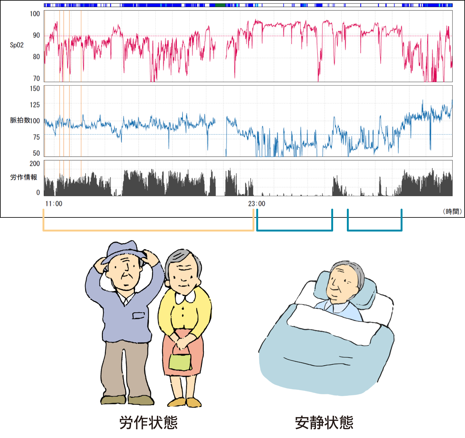 また、労作情報の数値により、労作期間を推定し、労作/安静時に分けてSpO2値を集計します。この労作情報は、行動記録などと合わせ、SpO2低下時の患者の状況を推定する際の参考情報とすることができます。