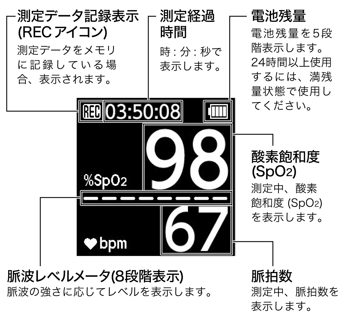 ※PULSOX-500iは、運動強度(Mets)の測定はしていません。また、液晶表示部に労作情報は表示されません。