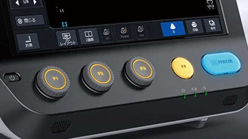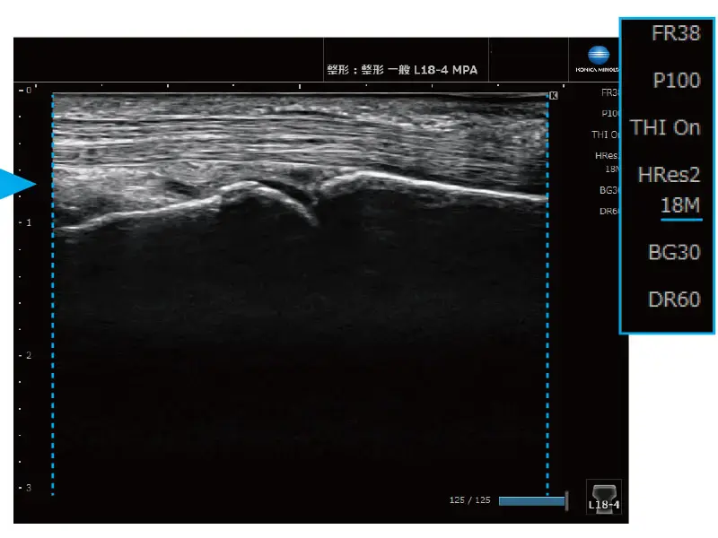 表示深度を変更するだけで、あらかじめ設定した画質パラメーターが適用されます。例えば、表示深度を浅くすると高周波に、深くすると低周波や台形走査へ自動的に切り替わります。