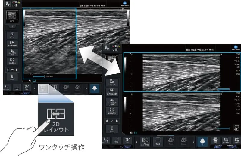 浅部を多様する運動器診断をストレスなく行うため、上下2画面表示を搭載。また、過去に診療した画像を呼び出し、検査中の画像と比較も可能。左右表示が必要な場合もワンタッチ操作で切り替えが可能です。