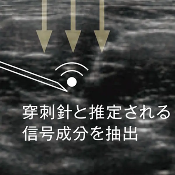 独自の画像解析処理技術により穿刺針と推定される変化を認識し、Bモード画像上に穿刺針強調表示を行う機能です。