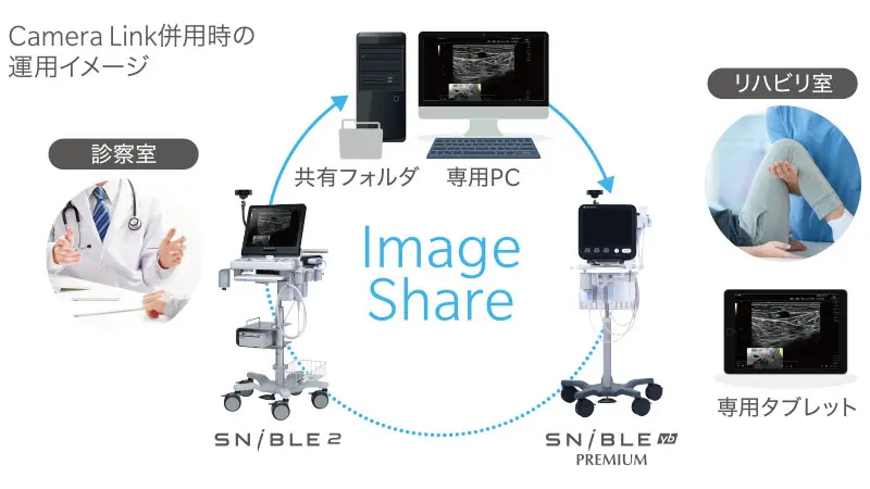 超音波診断装置で取得した静止画や動画を専用PC上の共有フォルダに保存し、他の超音波診断装置(本機能に対応しているSNiBLEシリーズ/SONIMAGEシリーズ)やタブレットから、共有フォルダのデータを参照できます。Camera Linkとの併用により、カメラ画像や音声情報も共有できます。医師とコメディカルをつなぐ新しい情報共有ツールです。