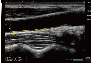 頸動脈の前壁と後壁の内中膜複合体を自動で検出し、内中膜複合体厚(IMT)をワンタッチで自動計測します。最大2cm幅での計測が可能です。