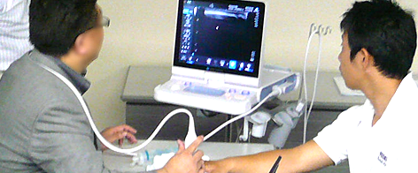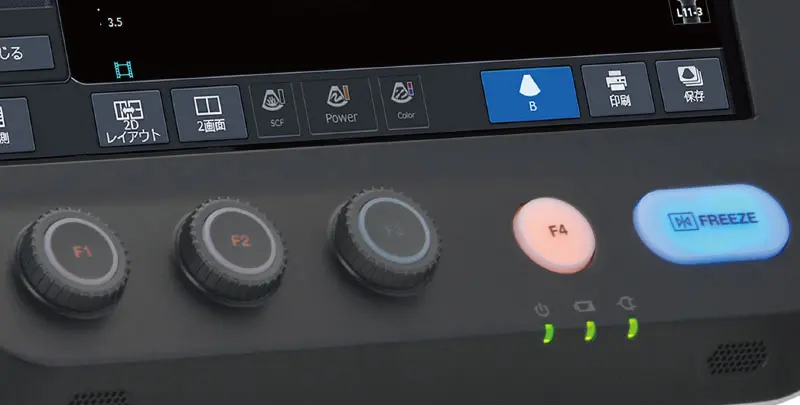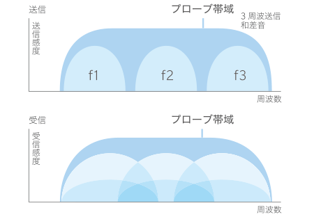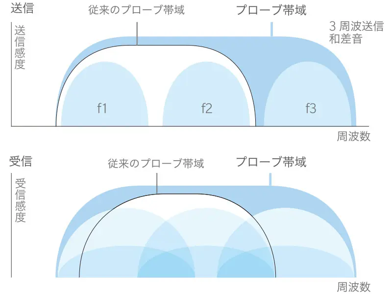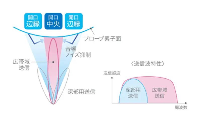 独自開発の広帯域高周波プローブと画像エンジンを組み合わせ、帯域内に入ってくる多くの差音/和音/高調波を送受信することに成功、高分解能と深度を両立させ高画質を実現しました。