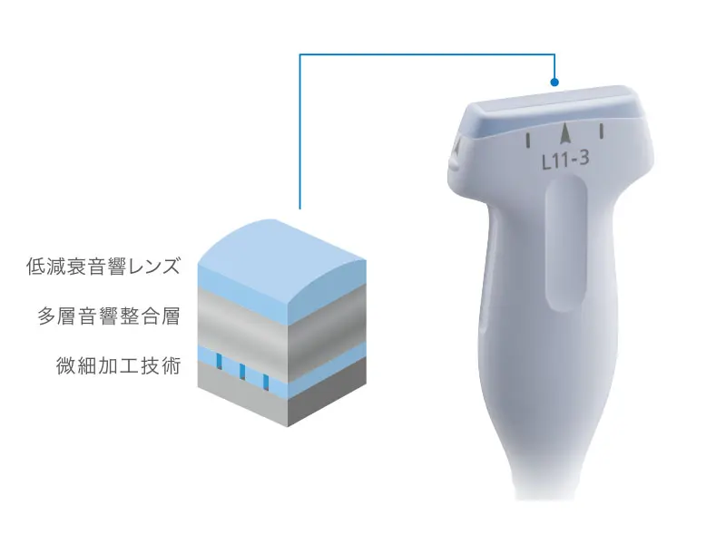 高感度化と広帯域化を両立するため、プローブ先端部にある音響整合層には、高度なシミュレーション技術で導き出した多層整合層構造を開発・採用しました。