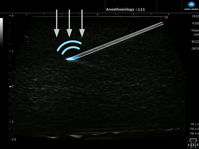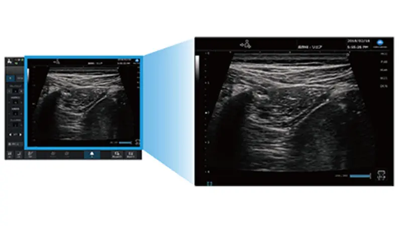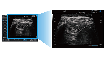 表示範囲を拡げることでオリエンテーションをつけやすくします。刺入の早い段階で針が表示されるので、より安心して針を進められます。高画質を維持したまま、台形走査をすることが可能です。