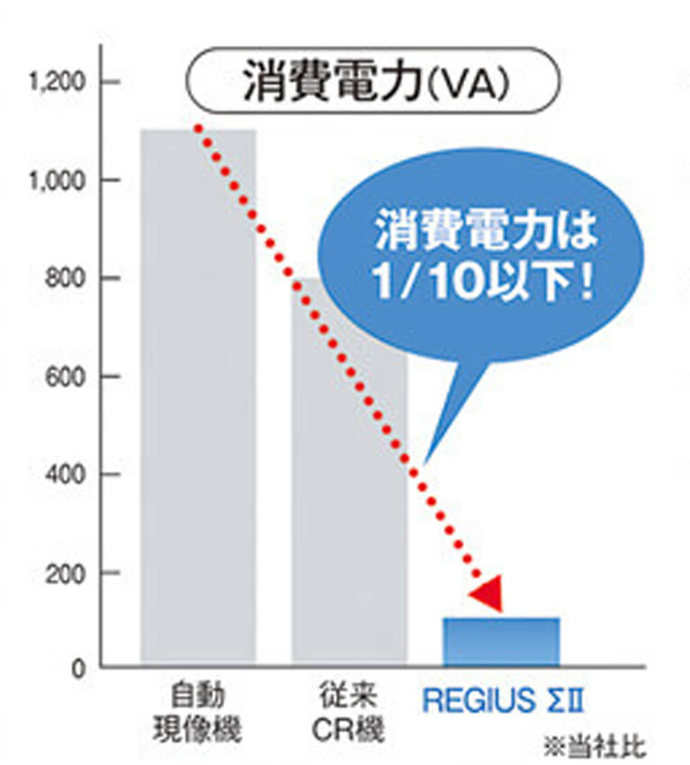 消費電力はわずか100VA。自動現像機と比較すると約1/10以下の低消費電力を実現しました。従来のCR機と較べても電気代は約半分以下。経済性に優れたCR装置です。